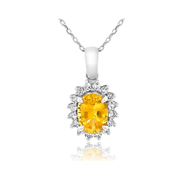 This 18k white gold necklace features a sunflower design with a halo of round diamonds. The pendant is set with a yellow sapphire that adds a touch of elegance to the design. The necklace features a 1.00 carat yellow sapphire pendant with a halo diamond setting, set with a total of 0.18 carats diamonds. This exceptional necklace design is a perfect gift that could be worn regularly and would never go out of style.