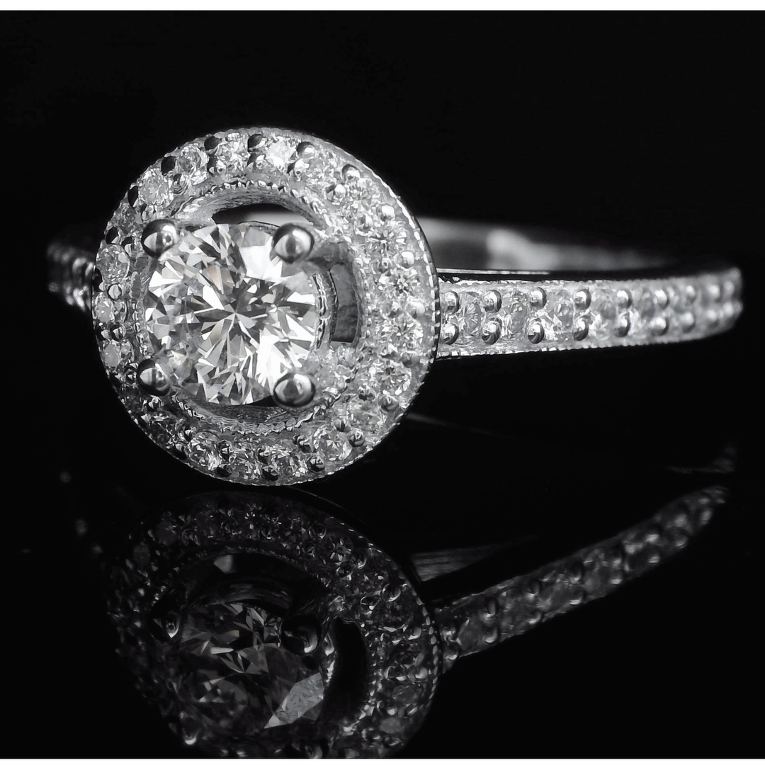 This elegant halo engagement ring in 18K white gold offers a timeless silhouette with a touch of extra brilliance. A beautiful round center stone takes center stage, framed by a delicate halo that enhances its presence. The band is embellished with sparkling accents, adds to the ring’s overall allure. A perfect symbol of a love that shines.