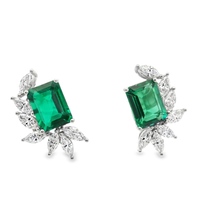 The marquise diamonds curve elegantly around the central emeralds. This architectural arrangement ensures that the light catches the piece from every angle. Moreover, the secure stud backing provides both comfort and safety for daily wear or special occasions. As a result, these earrings serve as the perfect statement piece for anyone who appreciates fine craftsmanship and bold design.