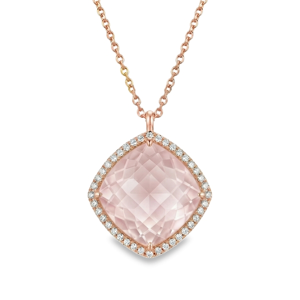 18K Rose Gold Rose Quartz and Diamond Halo Necklace GPD109