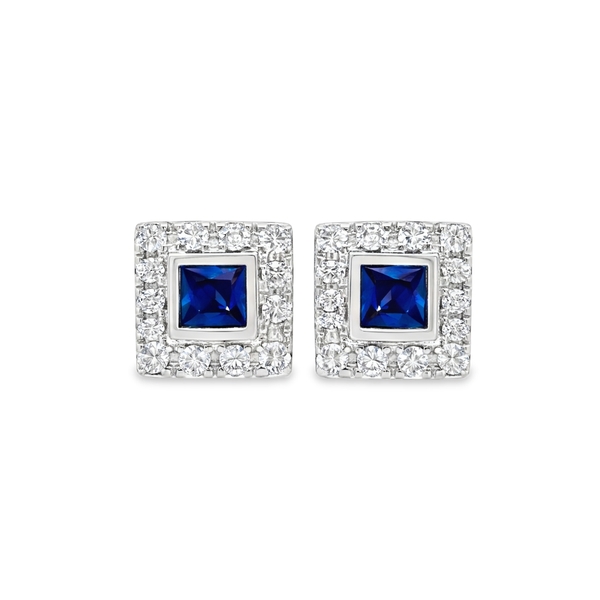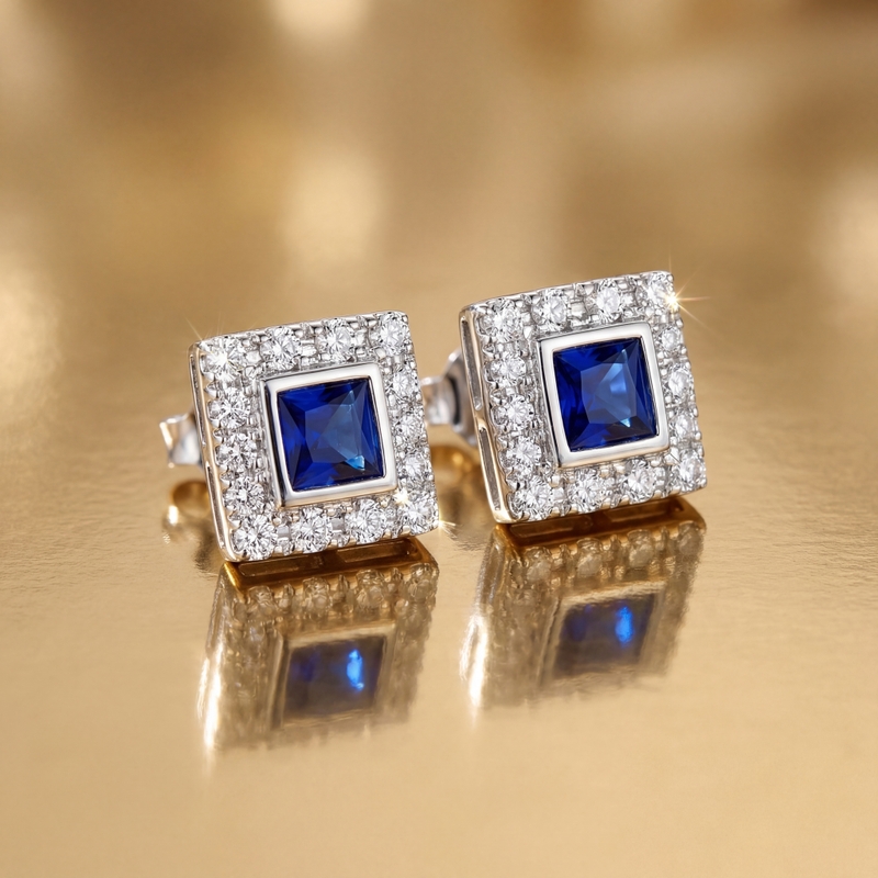 These 18K white gold sapphire and diamond earrings offer a striking geometric design that balances modern style with timeless luxury. Our expert jewelers precisely set two princess-cut natural blue sapphires, totaling 0.53 carats, into a sleek white gold frame. A brilliant square halo of natural diamonds, also totaling 0.53 carats, surrounds each sapphire to create a seamless wall of sparkle. These diamonds feature a G color and SI clarity grade, ensuring a bright and eye-clean radiance that perfectly complements the deep blue gemstones. This pair serves as an ideal choice for those seeking a bold yet elegant everyday accessory.