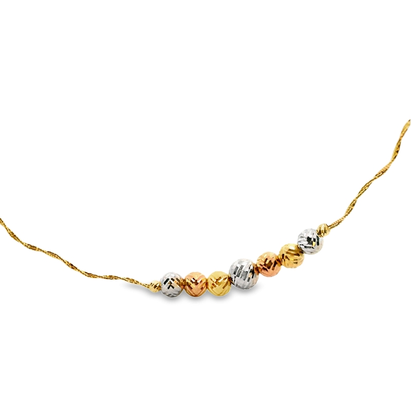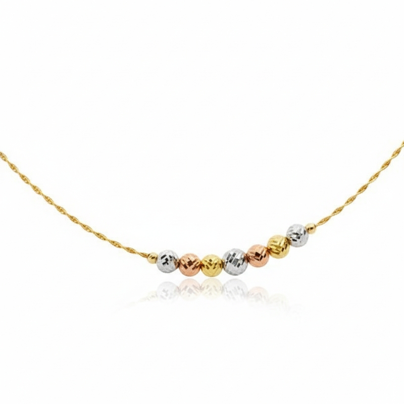 This elegant necklace features a delicate, smooth 18K yellow gold snake chain, which catches the light with a beautiful, continuous shine. Its fluid, flexible design gives it a sleek and polished look. The focal point is a series of small, round beads, each showcasing the beautiful interplay of yellow, white, and rose gold. These tri-color beads are evenly spaced along the chain, creating a balanced and eye-catching design. The varying gold tones add warmth and visual interest, making this necklace versatile enough to complement various outfits. The style is modern and minimalist, suitable for everyday wear or layering with other necklaces. The high karat gold ensures lasting shine and quality.