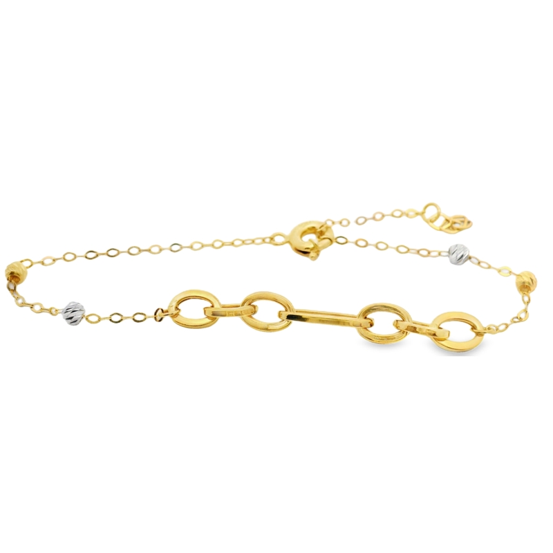 Experience the perfect balance of texture and shine with this elegant 18K Gold Link and Bead Station Bracelet. This design features a central arrangement of elongated yellow gold links, connected on either side to a delicate chain interspersed with luminous, diamond-cut beads. The beads alternate between yellow and white 18-karat gold, creating a subtle two-tone effect that catches the light beautifully. Secured with an adjustable clasp and extender, this piece offers a refined, shimmering look that is ideal for wearing alone or as part of a sophisticated stack.