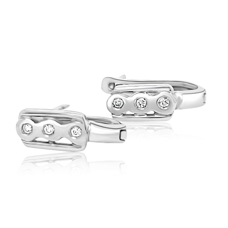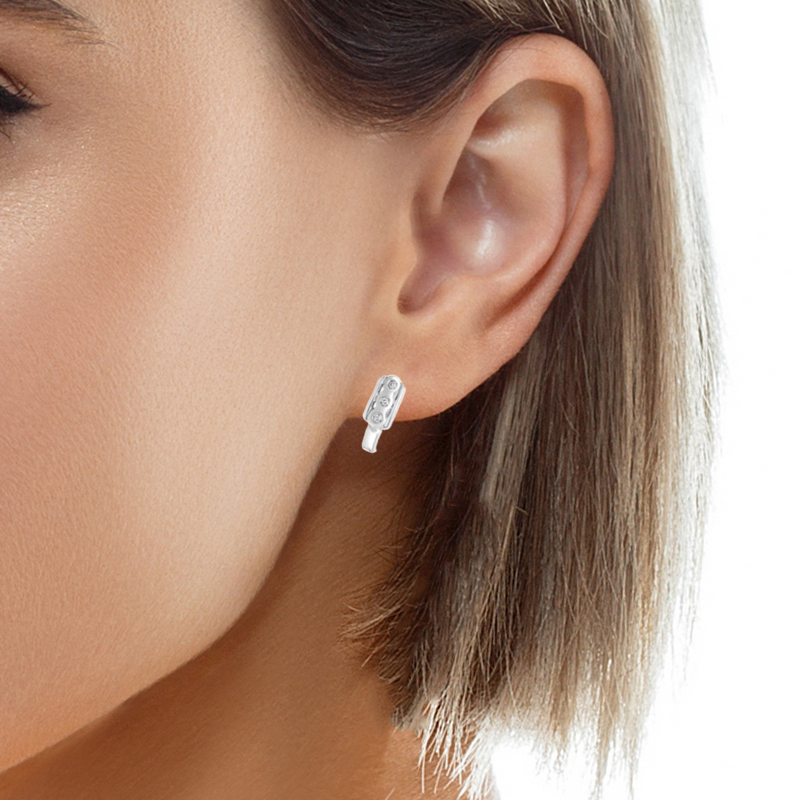 Introduce understated luxury with these elegant 18K White Gold Huggie Hoop Earrings featuring genuine diamonds. These small, polished earrings hug the earlobe and feature a striking horizontal bar set with three brilliant round-cut diamonds, totaling in 0.06cts. The sturdy hinged clasp provides a secure, comfortable fit making them perfect for daily wear.