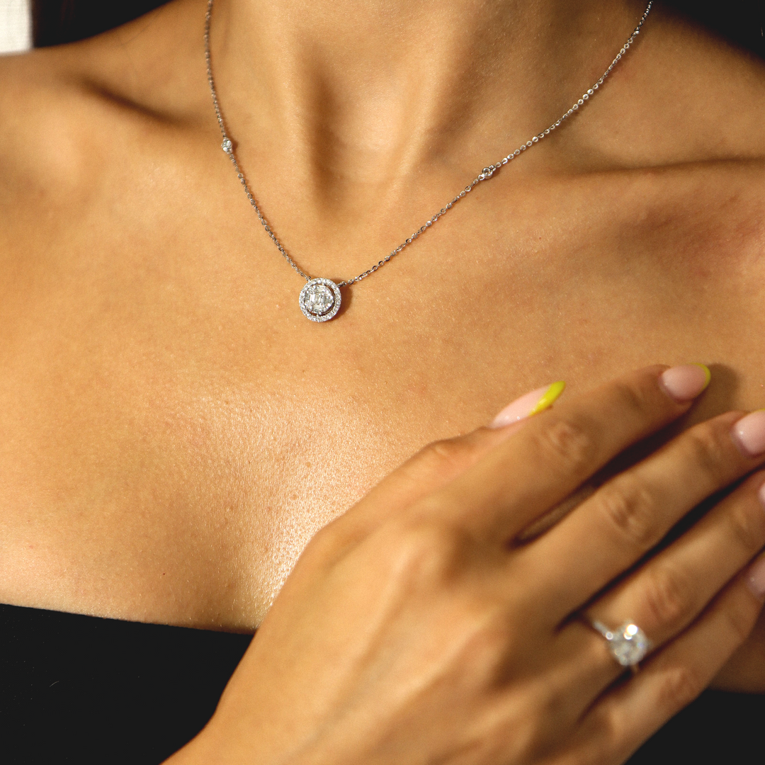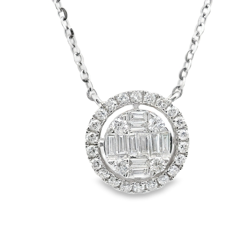Introducing our breathtaking 18K Gold Diamond Necklace. It is exquisitely designed for timeless elegance. This stunning round pendant showcases a unique blend of cuts. It achieves a brilliant total weight of 0.49 carats of natural diamonds. The captivating central medallion features 0.21 carats of sophisticated baguette diamonds. These are clustered to create a geometric, mosaic-like sparkle. A brilliant halo of 0.28 carats of round brilliant cut diamonds perfectly frames this center. Delicately wrapped around your neckline, this dazzling piece is an exquisite blend of sophistication and style. It offers maximum fire and brilliance in a classic, yet contemporary design.