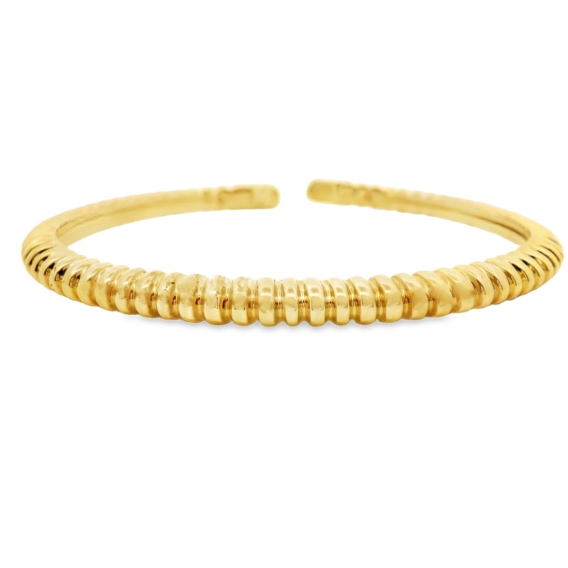 This 18K yellow gold bangle exudes a sense of understated elegance. It’s a versatile piece that could be worn on its own as a subtle statement or stacked with other bracelets for a more layered look. The classic design and high-quality materials suggest it’s a piece that can be enjoyed for years to come. The design is simple and timeless, featuring a smooth, polished gold surface with a distinctive grooved pattern. This pattern adds texture and visual interest without being overly ornate. The bangle is designed as a cuff, meaning it has an opening and doesn’t fully encircle the wrist. This allows for some adjustability in size and makes it easy to put on and take off.