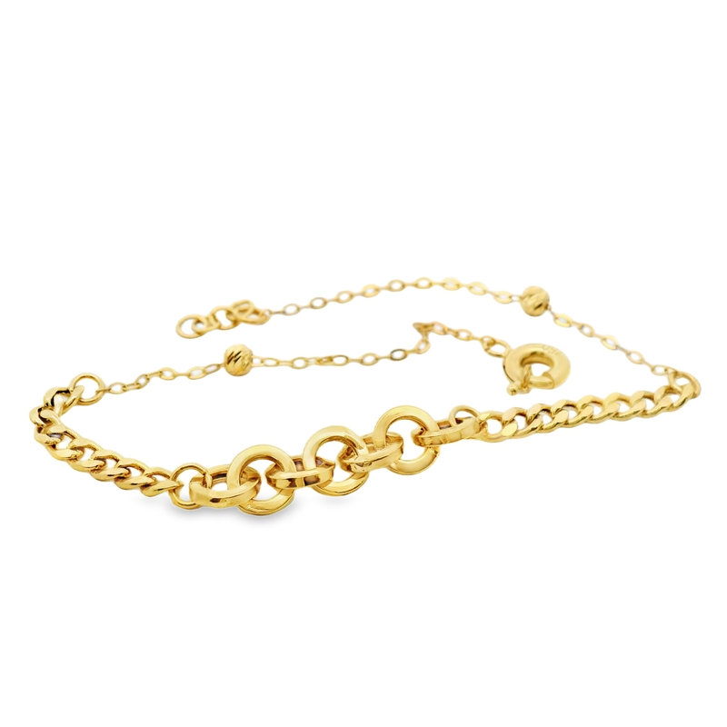 Experience sophisticated texture with this elegant 18K Yellow Gold Interlocking Rings & Chain Bracelet. This is a unique piece. It features a stylish Cuban chain complemented by a central station of three large, smoothly polished, interlocking ring links. Crafted from genuine 18-karat gold, the bracelet is finished with a fine chain extender and decorative bead. This ensures an adjustable and comfortable fit. It’s a contemporary statement piece perfect for adding dimension to your wrist stack.
