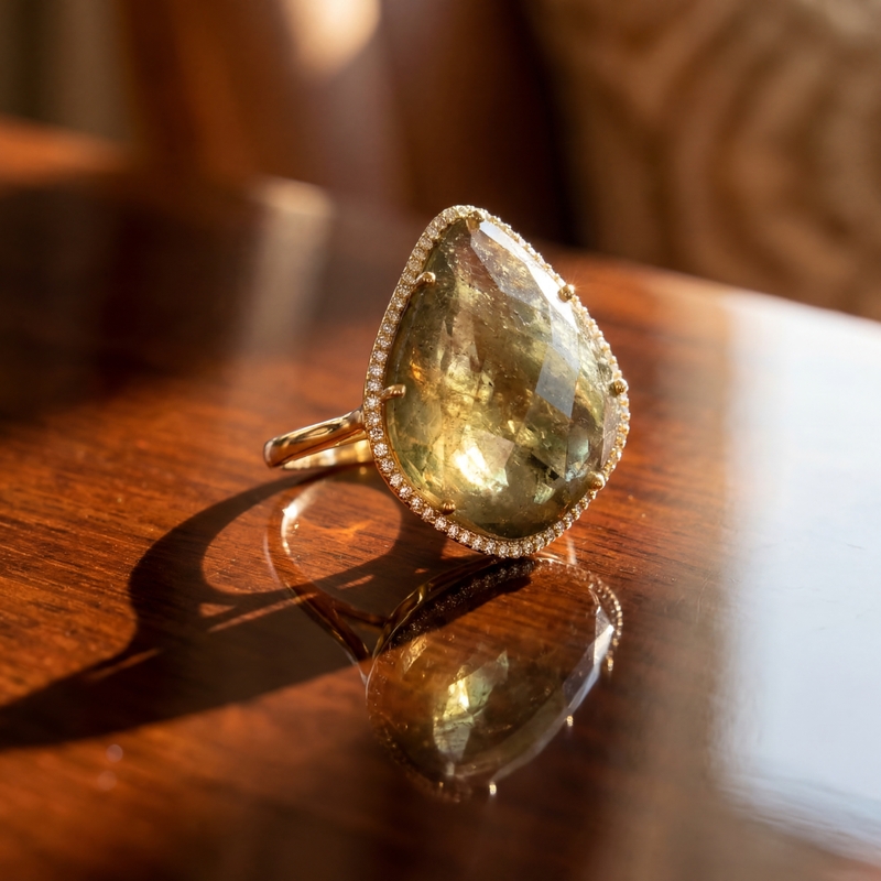 The ring is crafted in 18K yellow gold and features a large, faceted rosette Sapphire as the centerpiece. The Sapphire has a beautiful greenish-brown color with visible inclusions that add to its unique character. The rosette pattern is formed by the inclusion of microscopic needle-like crystals of rutile within the sapphire. Surrounding the Sapphire there is a delicate halo of diamonds adding to its sparkle and elegance.