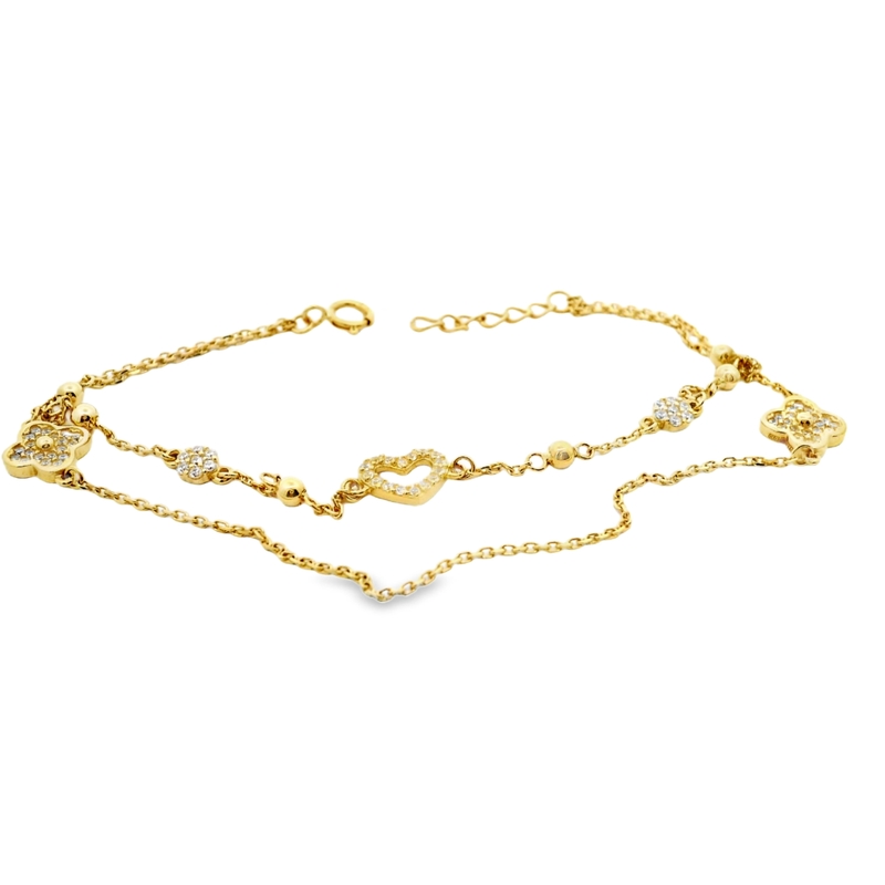 This 9K yellow gold bracelet is a charming piece of jewelry, ideal for everyday wear or special occasions. The combination of heart and floral motifs suggests a romantic or whimsical style. Its layered design and sparkling cubic zircons details make it a visually appealing accessory. The combination of classic motifs with modern design elements creates a versatile piece that can complement a variety of styles. The charms and beads are spaced evenly along the chains, creating a balanced and harmonious design.