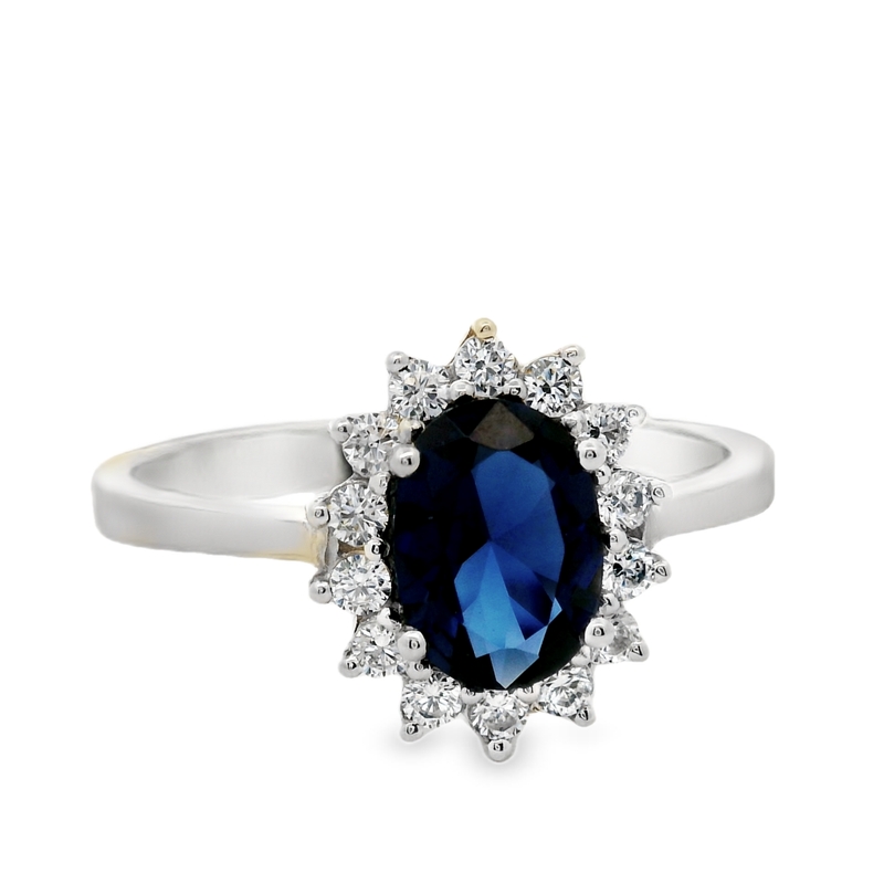 This striking ring is crafted from highly polished 9K white gold. The centerpiece is a large, vibrant, oval-cut blue stone. The royal blue of the stone is beautifully framed by a halo of smaller, brilliant-cut cubic zirconia stones. These white stones are set to create a radiant floral effect, which provides a stunning contrast to the central stone. The simple, tapered band allows the eye-catching cluster to be the main focus. This ring offers a classic, elegant, and regal look, perfect for those who want a pop of color and vintage-inspired design.