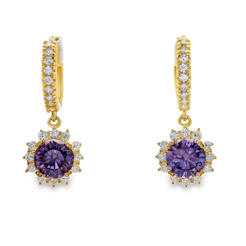 These elegant drop earrings showcase vibrant purple stones in a classic 9K yellow gold setting. The huggie hoop design adds a touch of modern flair, while the surrounding crystals enhance the stones’ brilliance. Versatile enough for day or night, these earrings are sure to impress.