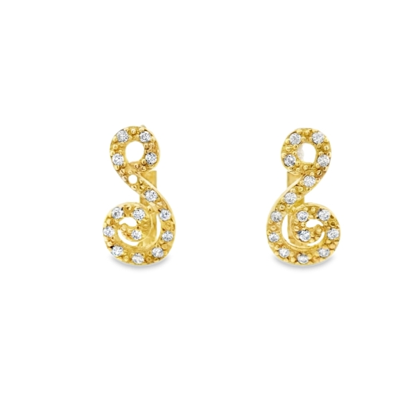 This is a pair of 9K yellow gold earrings with a fluid, stylized scroll design. Each earring features a graceful, asymmetrical scroll shape, reminiscent of a musical clef. The body of the earrings has a delicate, textured finish giving it a soft, non-reflective luster. The curves of the design are outlined in small, sparkling cubic zirconia. The stones are carefully placed along the curves of the scroll, adding a continuous line of sparkle that highlights the elegant shape.