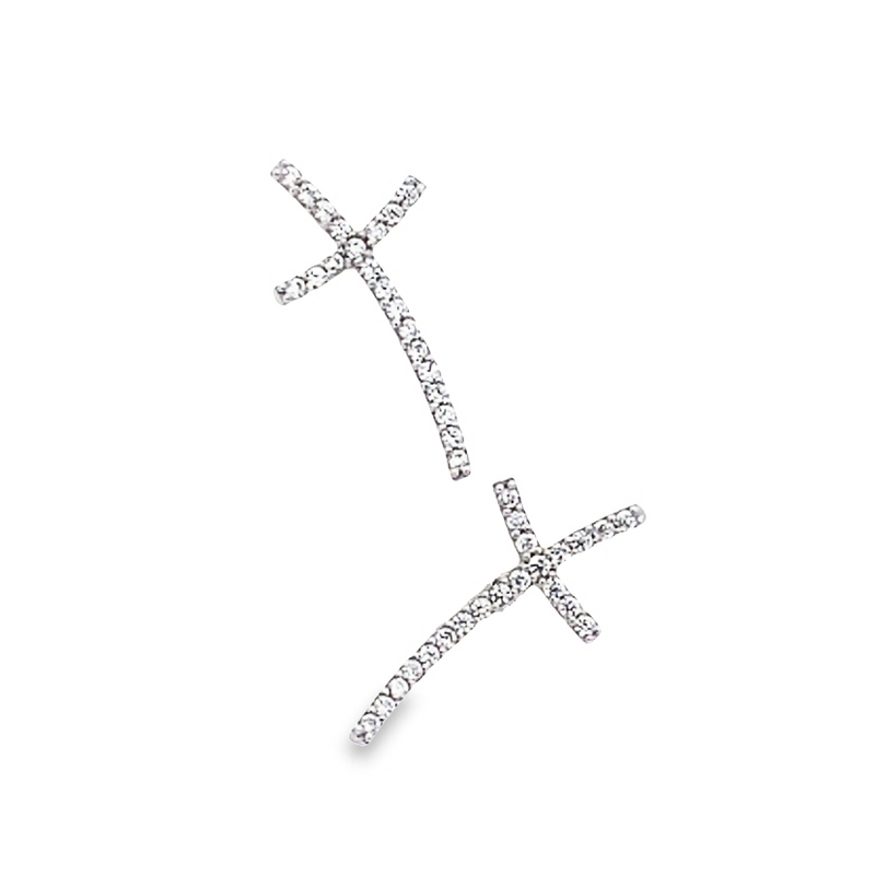 These 9K white gold pair of cross earrings feature cubic zircons set in a four-prong setting.