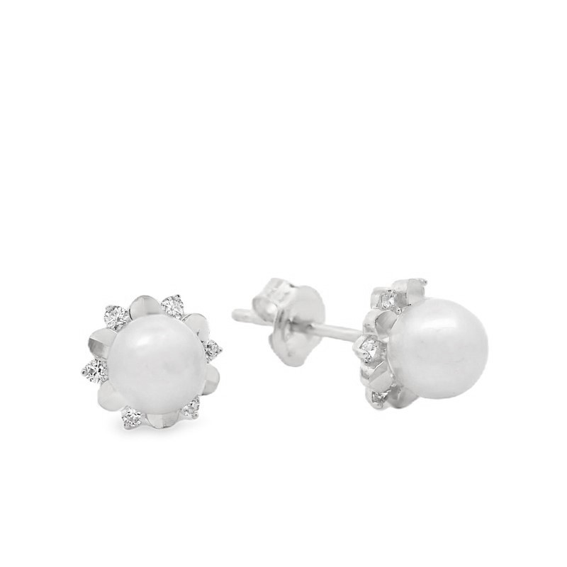 9K white gold charming stud earrings, each showcasing a delicate, propeller-shaped cluster. Three lustrous round pearls, nestled elegantly within individual gold bezels, create the design’s graceful ‘petals.’ Tiny, sparkling cubic zirconia at the center adds a touch of brilliance. The harmonious blend of creamy white pearls, radiant gold and subtle sparkle gives these earrings a classic, distinctive appeal. They are designed to sit comfortably on the earlobe, secured by a standard stud backing.