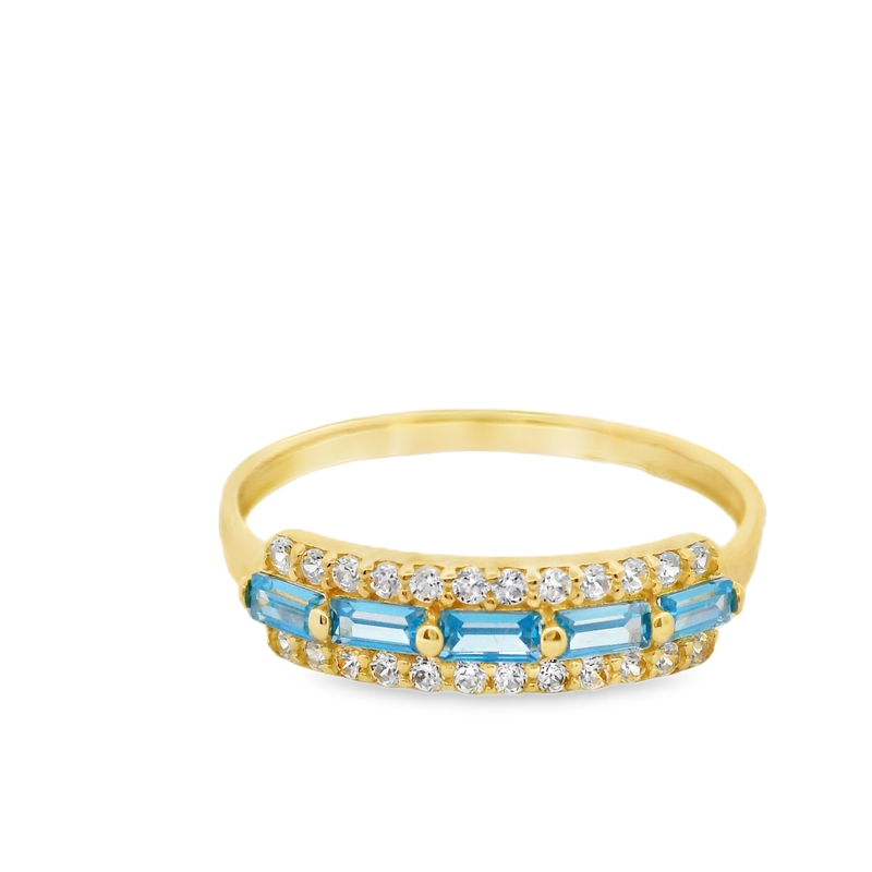 This elegant ring is crafted from 9K yellow gold, giving it a warm and classic golden hue. The ring showcases a central row of rectangular-cut blue cubic zircons, horizontally set. Above and below this central row, there are rows of small, round-cut cubic zircons that add sparkle to the piece.