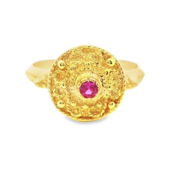 Introducing our exquisite 9K yellow gold vintage-inspired ring, featuring a stunning red stone at its center. This timeless piece its perfect for adding a touch of glamour to any outfit. The intricate detailing on the band enhances the beauty of the red stone, creating a truly captivating look.