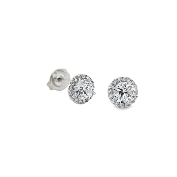 This is a classic pair of stud earrings in 9K white gold. Each earring features a prominent round, brilliant-cut cubic zirconia at its center, surrounded by a tight halo. The cubic zirconia are set with prongs, allowing light to pass through and maximize their sparkle. The cool, silvery tone of the metal gives the earrings a brilliant and versatile look, perfect for any occasion.