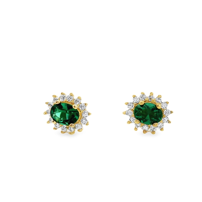 This is a pair of classic 9K yellow gold stud earrings featuring a bold halo design. Each earring is centered with a prominent, oval-cut green cubic zirconia. The vibrant, deep green color provides a striking focal point. The central green stone is surrounded by a radiating halo of round cubic zirconia stones. The earrings combine a traditional stud format with a distinctive, dramatic setting, making them a perfect statement piece suitable for both formal occasions and adding a pop of color to everyday attire.