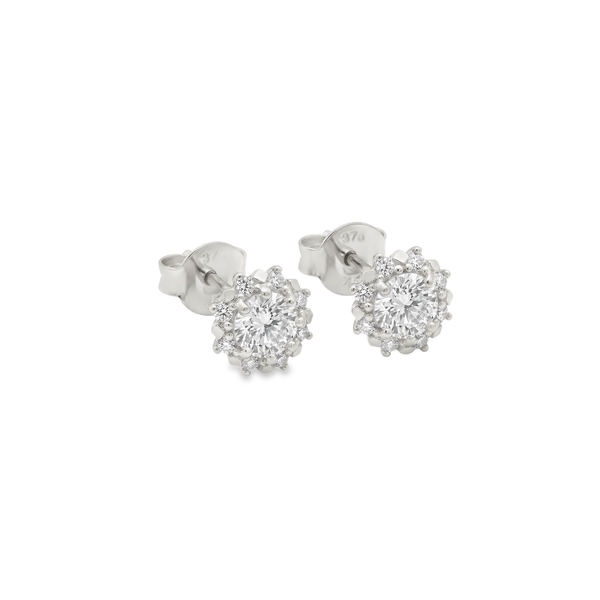 These stunning 9K White Gold Cubic Zirconia Halo Stud Earrings offer a brilliant alternative to traditional diamonds, providing exceptional fire and clarity. Crafted in high-quality 9K white gold, each earring features a large, round brilliant-cut cubic zirconia center stone that serves as the focal point of the design. A shimmering halo of smaller cubic zirconia stones encircles the center, creating a classic sunburst or floral motif that magnifies the overall light reflection and sparkle. Designed for both durability and comfort, these earrings utilize standard posts and butterfly backs to ensure they remain securely in place throughout the day.