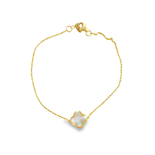 A delicate and charming Dainty 9K Yellow Gold Bracelet featuring a distinct Clover motif centerpiece. The central charm is a stylized four-leaf clover with a slightly beaded edge, giving it a subtle sparkle and definition. This lightweight motif is secured on a thin, polished link Chain with a short extender chain with small jump rings, allowing the wearer to adjust the length for a comfortable fit. This minimalist design makes it perfect for layering or as a subtle, everyday accessory.