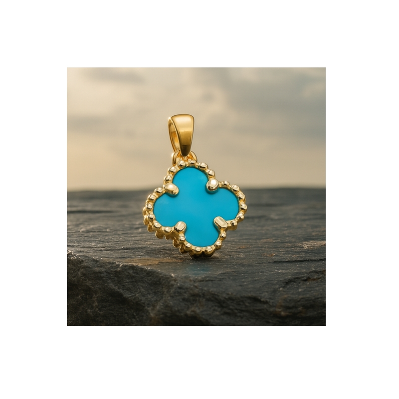 Brighten your jewelry collection with this stunning 9K yellow gold pendant. It features a vibrant turquoise stone in a classic four-leaf clover shape. A beaded gold border surrounds the bright blue center. This detail adds a touch of vintage charm to a modern design. The warm yellow gold creates a beautiful contrast with the turquoise hue. This piece offers a perfect balance of color and luxury for any style.