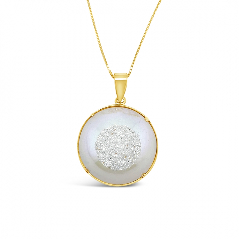 This striking statement pendant showcases a bold, oversized circular design crafted in polished 9K yellow gold. The centerpiece features a large, smooth backdrop with a shimmering cluster of natural Druse Quartz crystals. This unique combination of iridescent smooth stone and crystallized texture creates a luxurious, eye-catching focal point. The chain is not included with this pendant.