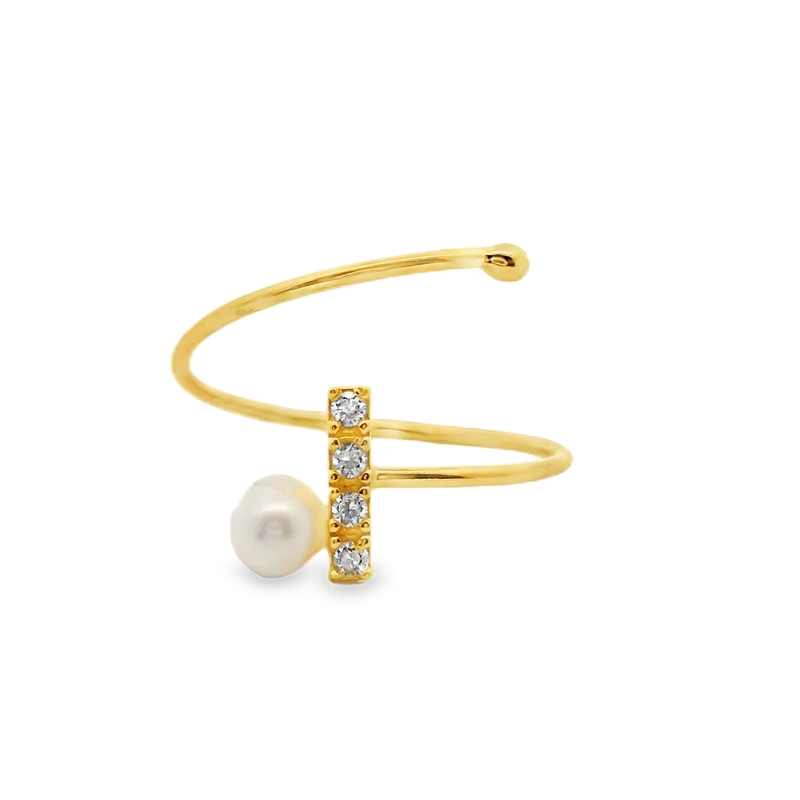 This is a Sterling Silver 925 Wrap Ring, a piece that effortlessly blends modern design with classic sophistication. The ring features a unique spiral design, allowing for slight adjustability and comfortable wear. The ends of the spiral showcase two beautiful focal points: a lustrous cultured pearl and a striking bar of three brilliant Cubic Zirconia stones. The rhodium plating gives the sterling silver a bright, durable, high-polish finish that resists tarnishing. This versatile piece is perfect for making a modern statement and can be worn for any occasion.