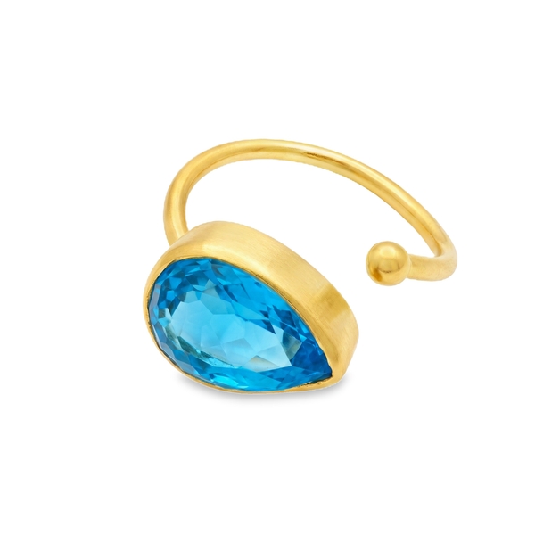 This elegant open-band ring is crafted in 925 sterling silver with a luxurious yellow gold plating. It offers a sophisticated and modern aesthetic. The centerpiece features a vibrant, pear-cut blue cubic zirconia stone, faceted to maximize light reflection and showcase its brilliant transparency.