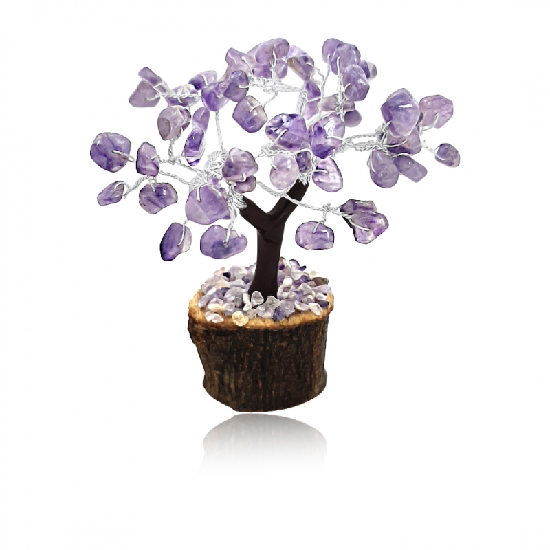 This small, handcrafted Amethyst “Luck” Tree is a beautiful and affordable way to bring positive energy into your space. This miniature tree features a twisted wire trunk and branches adorned with dozens of tiny, polished amethyst gemstone chips. The tree stands on a natural base, a small slice of wood, adding to its organic charm. Since each tree is handmade with natural stones, it is a one-of-a-kind piece, with slight variations in color, size, and shape.