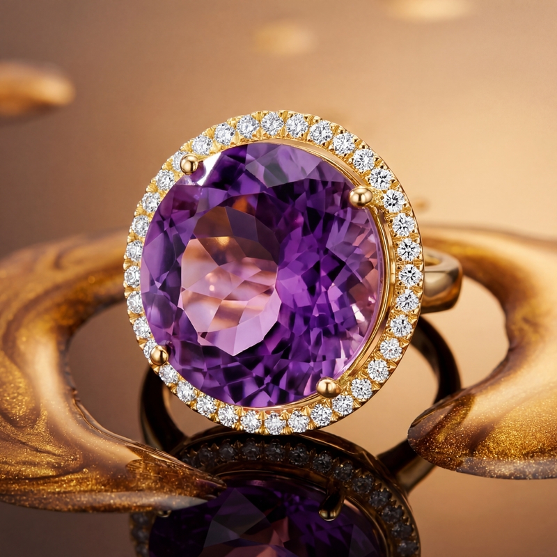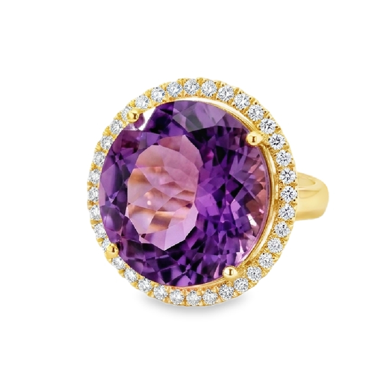 A sizable Amethyst gemstone, exhibiting a rich, deep purple hue characteristic of high-quality Amethyst, forms the ring’s focal point. The stone’s round checkers cut, enhances its brilliance. A halo of small, round brilliant-cut diamonds encircles the Amethyst, adding significant sparkle and creating a striking contrast with the Amethyst’s purple color. Crafted from 18K yellow gold, a precious metal known for its warm, rich color and durability, the ring boasts its quality. The diamond halo dramatically enhances the Amethyst’s size and presence, making it appear larger and more glamorous. Designed as a statement piece, the ring intends to be noticed and admired. Its large size and combination of vibrant colors and sparkle make it a true showstopper.