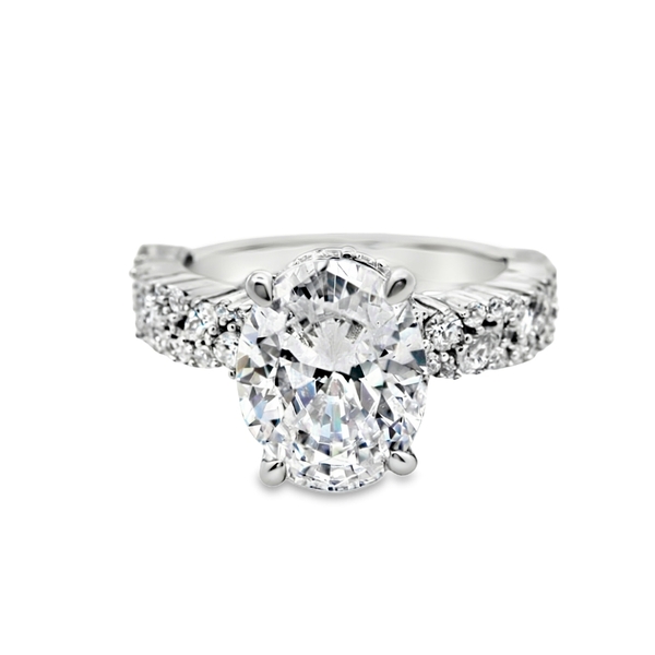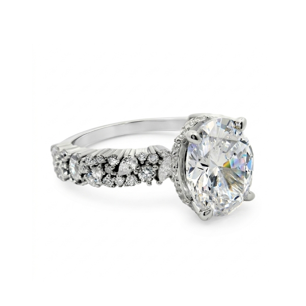 Unmatched brilliance and elegance! This exquisite ring features a magnificent 3-carat oval-cut cubic zirconia center stone, secured by four sleek prongs. The premium 925 sterling silver band is further accented by sparkling stones, creating a luxurious and affordable alternative to a traditional diamond ring. It is finished with a layer of rhodium plating. This layer gives the silver a bright, platinum-like appearance, resists tarnishing and adds durability. Perfect for an engagement, anniversary or a dazzling addition to your own collection.