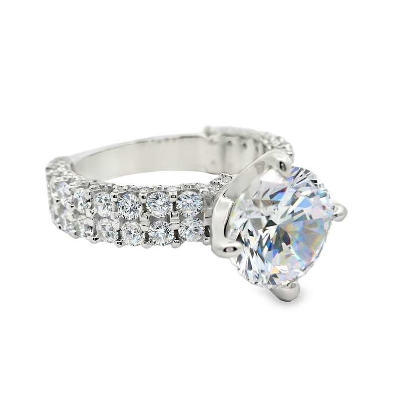 This exquisite engagement ring delivers breathtaking size and sparkle, offering the look of a high-carat diamond at an accessible price. Features an impressive 3 carat brilliant round-cut cubic zirconia (CZ), known for its exceptional fire and clarity. The ring is expertly crafted from high-quality 925 sterling silver. It is finished with a layer of rhodium plating. This layer gives the silver a bright, platinum-like appearance, resists tarnishing and adds durability. The magnificent center stone is held securely by a classic four- prong setting, allowing maximum light to reach the stone. The band is typically sleek and polished to let the center stone dominate. This ring is a perfect symbol of commitment, offering extraordinary visual impact and timeless elegance.