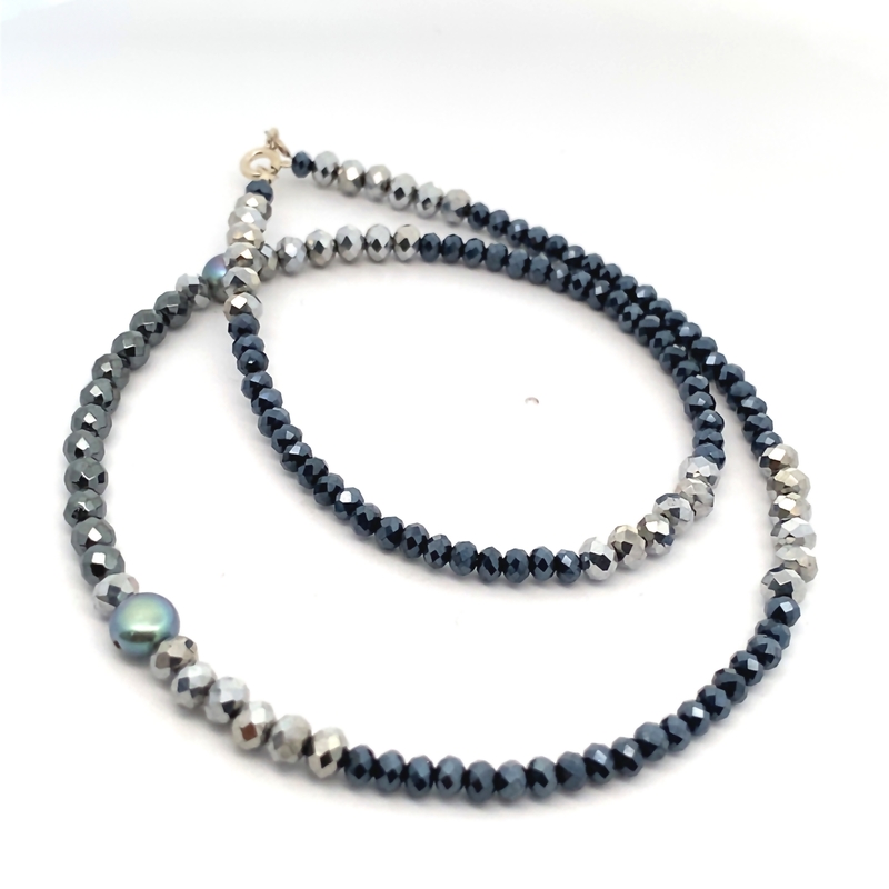 Faceted beads in varying shades of gray and black create a beautiful gradient effect on this necklace. A single, iridescent pearl adorns this necklace, contrasting with the faceted beads.