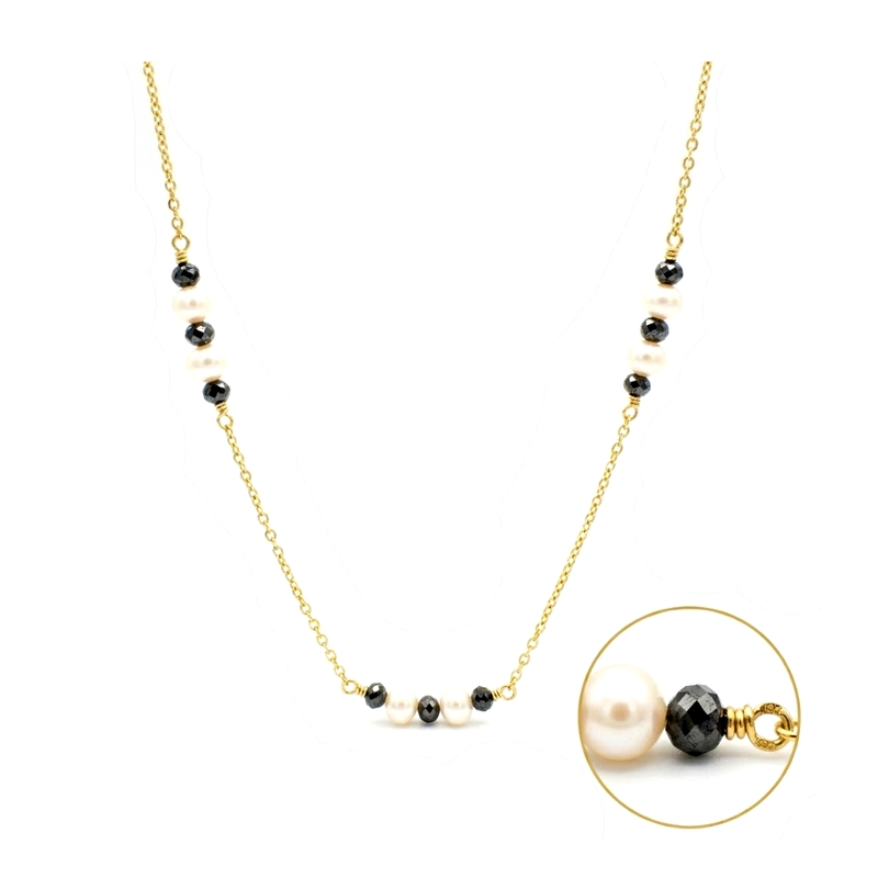 This elegant necklace features a delicate cable chain crafted in 18K yellow gold, measuring 40 cm in length for a perfect collar-bone drape. The design showcases a rhythmic arrangement of shimmering fresh water pearls interspersed with faceted black diamond beads, creating a modern yet timeless aesthetic.