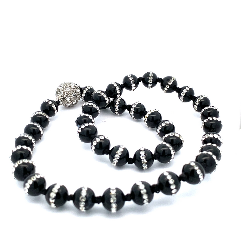 Crafted with meticulous attention to detail, this stylish piece features black Onyx beads with Swarovski delicately strung together to create an eye-catching cascade.