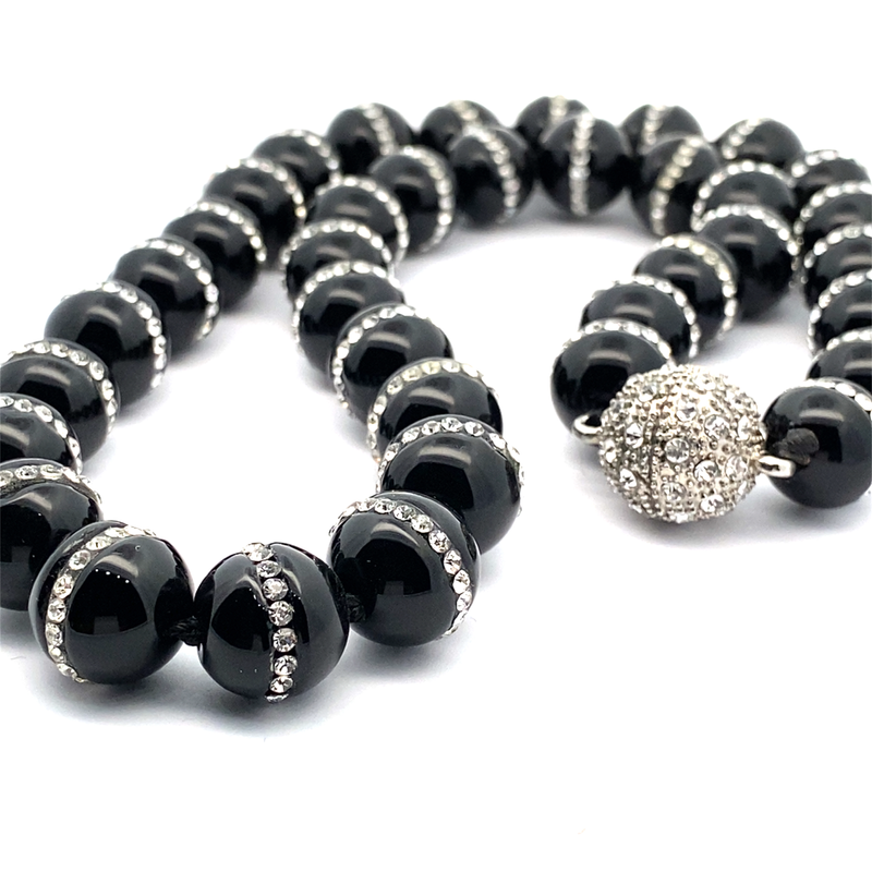Lustrous black Onyx beads necklace featuring Swarovski with a metal clasp designed to captivate and adorn the neck of glamorous individuals like you.