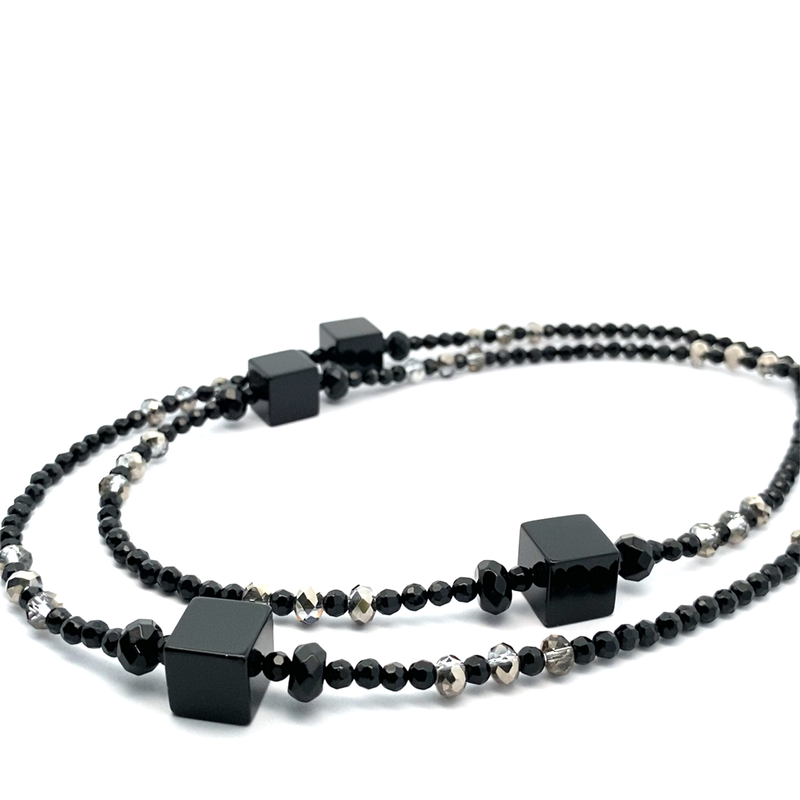 This fashion-forward black onyx necklace, adds an elegant touch to any ensemble. This trendy accessory is designed to make a statement; its length extends gracefully, effortlessly elongating your neckline and imparting a sense of sophistication.