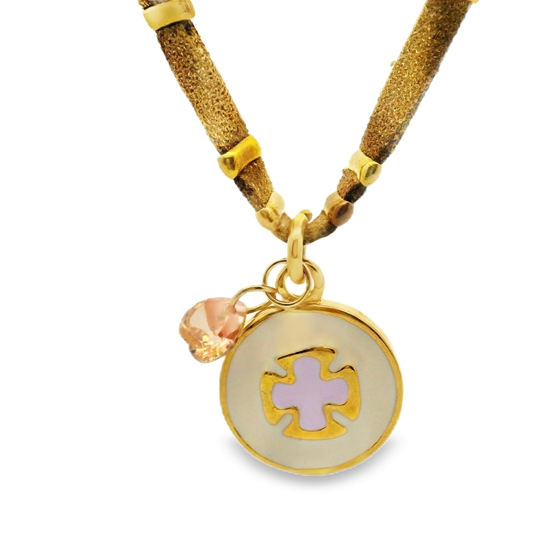 A blend of spiritual symbolism and bohemian chic defines this stylish fashion necklace. It features a dark brown, suede leather cord, ensuring comfortable and casual wear. The focal point is a circular, gold-rimmed pendant with a unique design: a stylized cross shape is delicately integrated into its white surface. Artfully overlapping the cross is a sparkling cubic zircon.