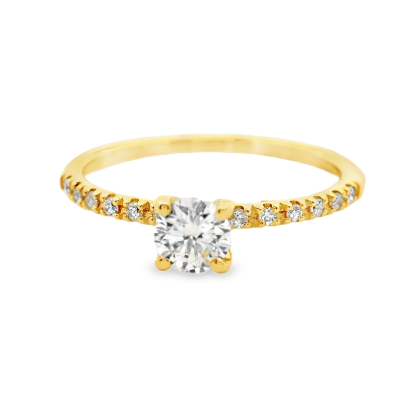 This exquisite ring features a brilliant Round Cut Diamond in a refined four-prong setting, set upon a delicate band of 14-Karat Yellow Gold accented with a trail of pave-set diamonds. This combination creates a stunning display of continuous fire and brilliance. This diamond’s quality is verified by the IGI (International Gemological Institute), one of the most trusted names in global diamond grading. The slim, accented band is perfect for comfortable everyday wear.