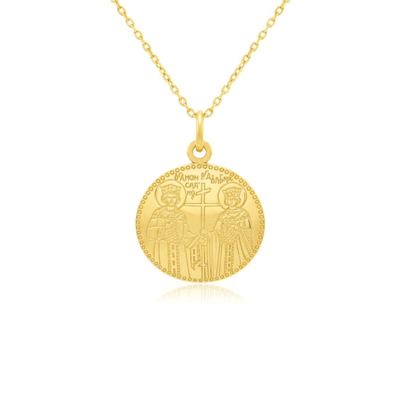 Embrace timeless tradition with this exquisite 9K Gold Konstantinato Pendant. This beautifully crafted piece features a classic Konstantinato design, a symbol of faith and protection deeply rooted in Greek Orthodox heritage. This Byzantine Coin is a Double-Sided Pendant showcasing Saints Helen and Constantine, serving as a powerful good luck charm. Crafted from radiant 9K gold, the pendant features intricate detailing, making it a cherished heirloom and a meaningful expression of devotion. The pendant measures 17.5 mm in diameter.
