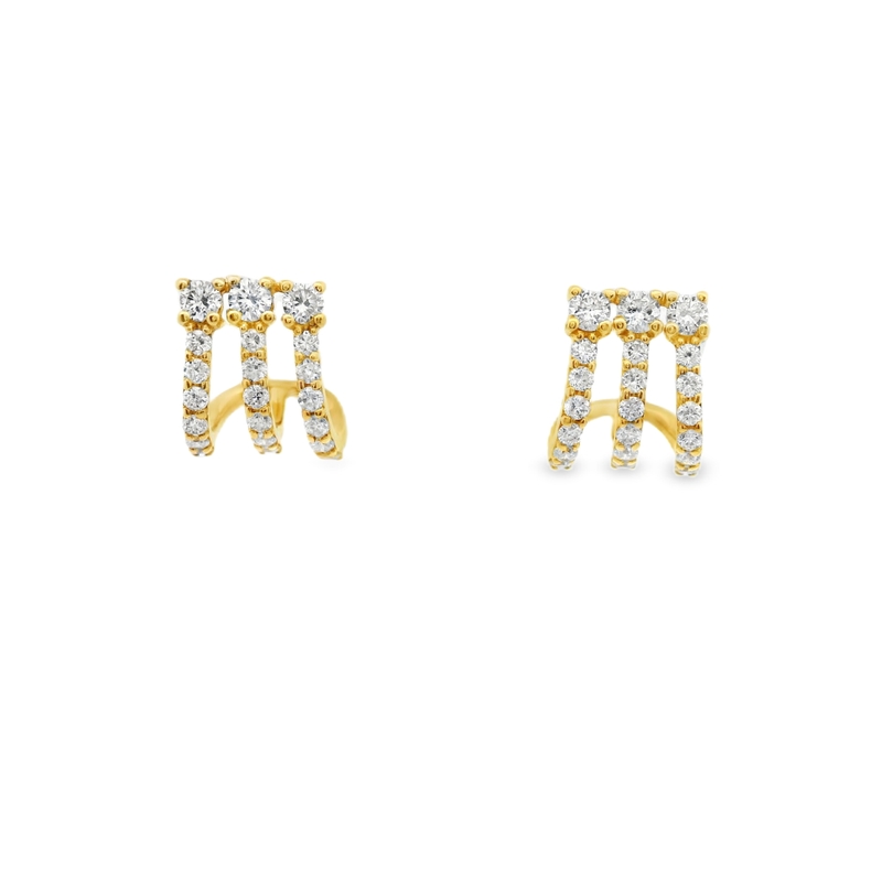 Make a strong, sophisticated statement with these modern Multi-Row Diamond Earrings. We craft these studs expertly in gleaming 18-Karat Yellow Gold. The striking design has three rows, giving the look of multiple piercings in one secure, comfortable piece. These earrings are the perfect way to make your daily style better or to finish an evening look. These earrings hold many brilliant, natural Round Brilliant Cut diamonds. The total diamond weight is an impressive 0.38 carats. We meticulously set the diamonds across three parallel bands of gold. This setting ensures that light catches the stones from every angle. The result is continuous, dazzling sparkle that truly stands out. The three-row structure gives the earrings a substantial, luxurious feel. They remain comfortable and lightweight for all-day wear. The bright, white diamonds contrast beautifully against the warmth of the 18K yellow gold.