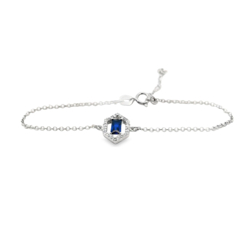 Embrace geometric style with this captivating 925 Sterling Silver Hexagon Bracelet. This piece showcases a modern blend of color and shape that instantly elevates any outfit. The centerpiece is a bold baguette-cut Blue Cubic Zirconia (CZ) stone, beautifully set within a contemporary hexagonal frame. The bezel and outer edges of the charm are accented with smaller, brilliant Clear CZ stones for extra sparkle. This lightweight, dainty chain design is perfect for creating a stacked look or wearing as a single vibrant accent. Includes an adjustable extension chain for comfortable sizing.