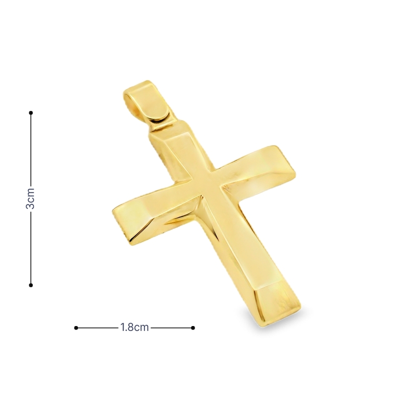 This substantial 9K Gold Cross Pendant is an elegant symbol of enduring faith and classic style, expertly crafted in rich, highly-polished 9-karat yellow gold. The cross features a timeless, three-dimensional design with beautifully tapered and bevelled edges, maximizing the reflection of light. The high-polish finish highlights the pure beauty of the gold without the use of stones. This classic 9K Gold Cross Pendant is durable enough for daily wear and comes with a generous bail, allowing it to fit various chain styles. As a profound symbol of devotion, this piece makes a deeply meaningful gift for communions, confirmations, or any significant life milestone.