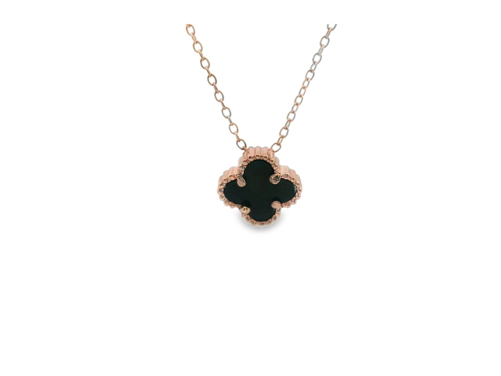 This is a necklace with a pendant in the shape of a four-leaf clover. The pendant is made of silver with rose gold plating with a black stone in the center. The pendant is suspended from a cable silver chain with rose gold plating.