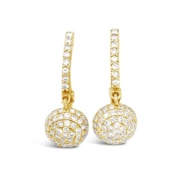 With a total weight of 0.60cts, these diamonds are carefully set to catch the light from every angle, creating a mesmerizing shimmer with every movement. The circular, pavé-style drop design offers a unique texture that is very eye-catching. The diamonds are hand-selected for their brilliance and are held in a secure setting that ensures longevity. Because of their dangling style, the earrings provide a graceful silhouette that frames the face beautifully. Furthermore, the combination of sparkling diamonds and yellow gold ensures these earrings are a sophisticated addition to any jewelry box. The earrings feature a diamond-encrusted hoop-style closure that flows seamlessly into the drop element.