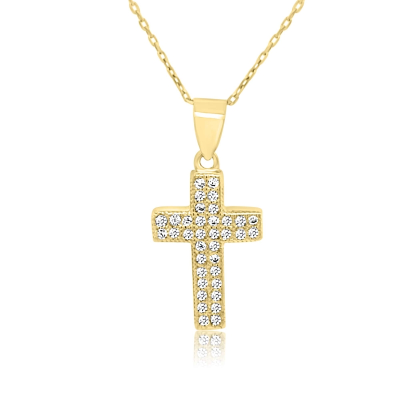 Experience breathtaking brilliance and luxurious style with this Double-Row Pave Cross Pendant. The entire surface of the cross is completely covered in two continuous rows of Cubic Zirconia stones for dazzling wall-to-wall sparkle. Finished in a rich 9K yellow gold tone this piece makes a beautiful statement of faith and elegance.