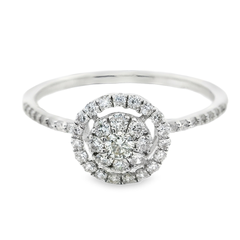 This exquisite ring features a dazzling cluster of brilliant round-cut diamonds at the center. In addition, it is surrounded by a magnificent double halo setting. This combination of closely set diamonds creates the illusion of a much larger single stone. Therefore, it offers maximum sparkle and brilliance. The band is crafted from polished 18K white gold. Furthermore, it is adorned with pavé-set diamonds extending down the shoulders for a truly luxurious look. The total diamond weight is 0.23 carats. These diamonds feature VS clarity and G color. This ring is perfect as a stunning engagement ring. It also makes a significant anniversary gift or an elegant addition to any fine jewelry collection.