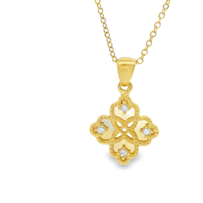 This 9K yellow gold floral pendant transcends mere accessory status; it is a symbol of beauty, nature and timeless grace. Its unique clover-like shape makes it a thoughtful gift for someone special, perhaps symbolizing good fortune or deep affection. This piece is ideal for gifting on occasions such as Mother’s Day, graduations, or birthdays. When you choose this pendant, you are acquiring a piece of jewelry crafted to last, blending classic design principles with a modern sparkle. The use of high-quality 9K gold ensures that the vibrant colour and polished finish will endure.