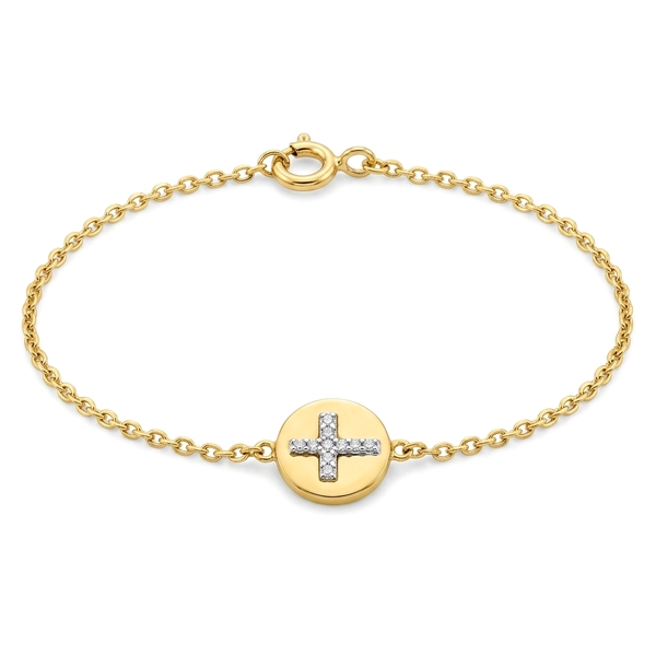 This dainty and meaningful 18K yellow gold chain bracelet is the perfect blend of subtle luxury and spiritual elegance. The fine, classic chain centers around a polished gold disc which is beautifully accented with a cross symbol paved with sparkling diamonds. The bracelet features approximately 0.08 carats total weight of brilliant diamonds. Lightweight and comfortable for daily wear, this bracelet is ideal for marking a milestone or celebrating your faith.