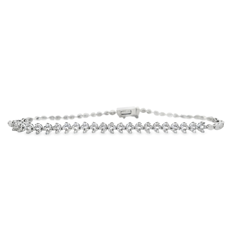 The bracelet showcases a continuous line of diamonds. The brilliant round cut diamonds are expertly set to create the illusion of larger, marquise-shaped stones. Furthermore, this unique design technique results in a dazzling, elongated look on the wrist. We use a prong setting style to set the diamonds securely. This setting technique maximizes the stones’ visible size and provides comfortable, secure wear. The brilliance of the design ensures that this Diamond Illusion Line Bracelet captures light from every angle.